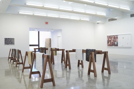In the current exhibition, Saban brings her radical approach to the realm of the outdoor domestic scene, which becomes a backdrop for the artist’s storytelling. Engaging the history of painting and the possibility of art-making as an alchemical process, Saban continues her investigation of the line between painting and sculpture. Presented in the main gallery, the Draped Marble works employ material that has undergone a transmutation, its once solid form now more akin to fabric than stone. Here, Saban reinterprets traditional sculptural material in order to plumb its relationship to painting, specifically by exposing the minerals in the stone, linking this to pigments used by painters from earlier eras. Formally, the marble’s broken surface betrays variations in the crystalline structures of the stone itself, revealing a range of abstract patterns and rendering stone as canvas.
